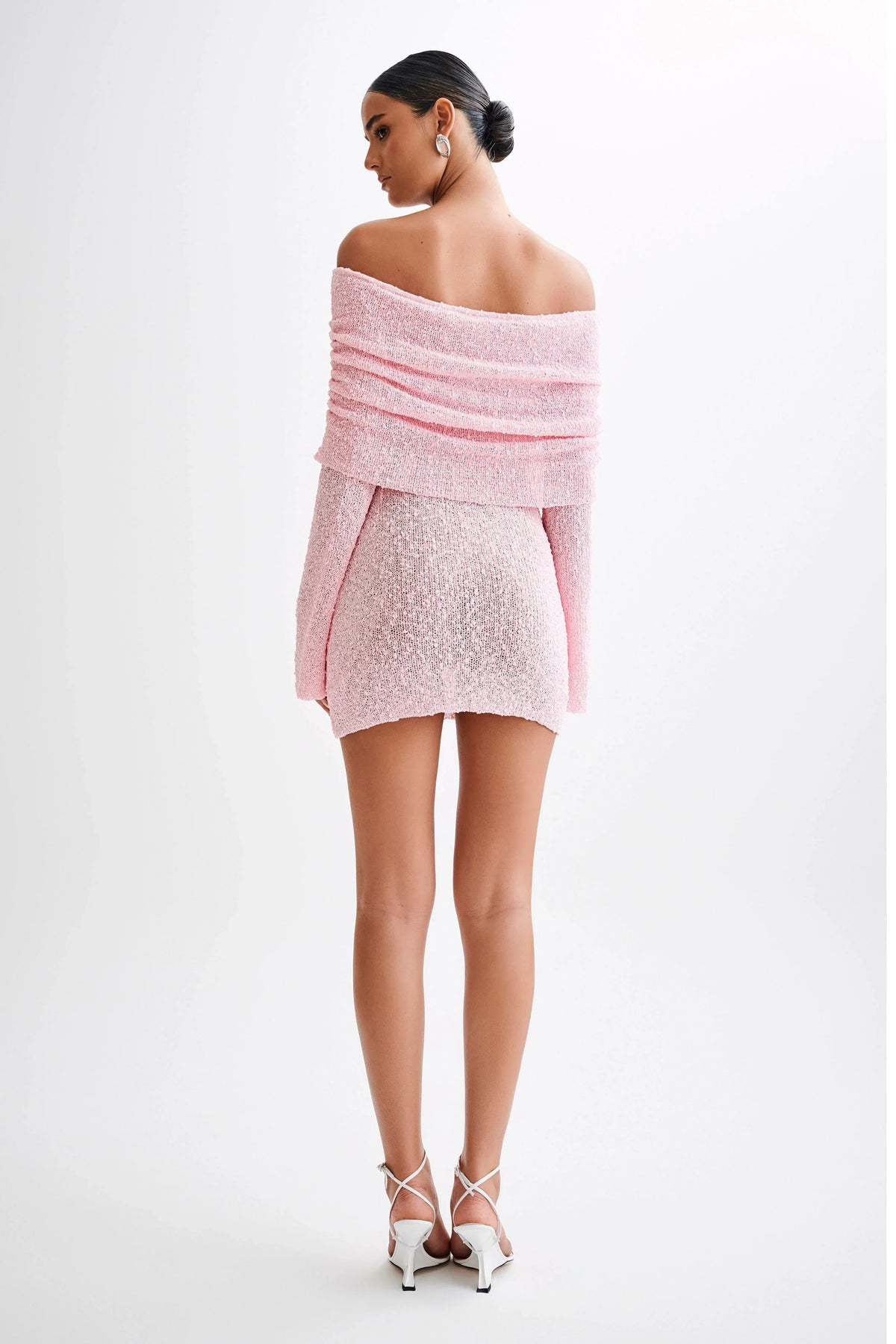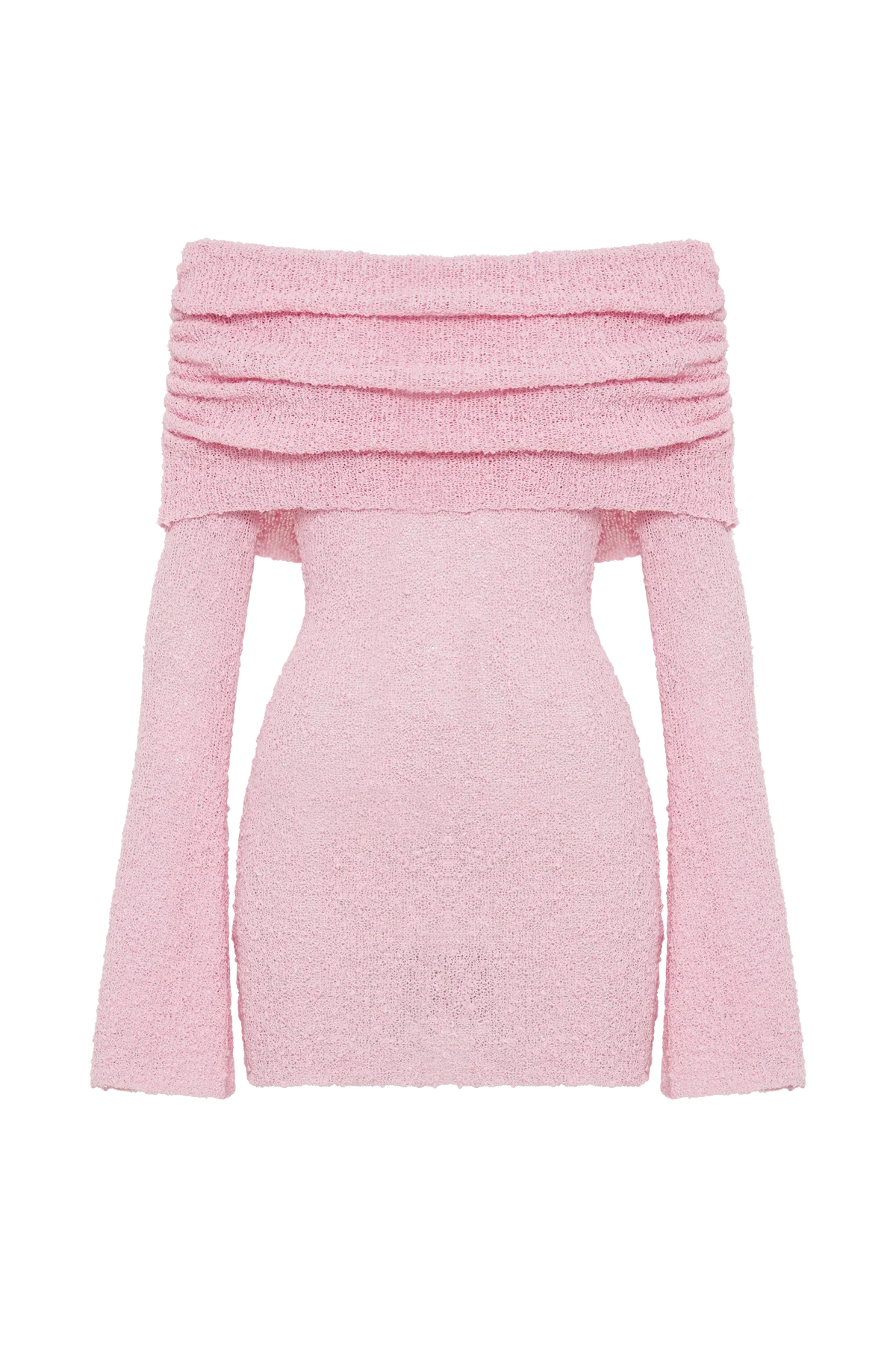 The SOLEIL Off-Shoulder Boucle Mini Dress brings a refined touch to any wardrobe. With its off-shoulder, strapless neckline, this dress emphasizes the shoulders in a contemporary, elegant way. Long sleeves and a delicate overlay add subtle sophistication, while the elasticated top edge provides a secure, comfortable fit. Made with a soft boucle knit, the dress offers a luxurious feel and effortless charm. Unlined for a lightweight, breathable design, the SOLEIL Mini Dress is versatile and perfect for warm-weather occasions. Style it with heels for a night out or pair with sandals for a relaxed day look—this piece radiates modern allure and timeless appeal.
